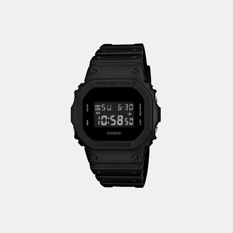 From G-SHOCK, the watch brand that is constantly setting new standards for timekeeping toughness, comes a basic DW5600 case silhouette with monotone black coloring. The face of the watch is all black with a matching LCD which creates a sleek and tactical look, even in the dark, the back lit display makes reading the time easy. Functions include stopwatch, countdown timer and alarm, so this model will cover all of your basic timekeeping needs.
